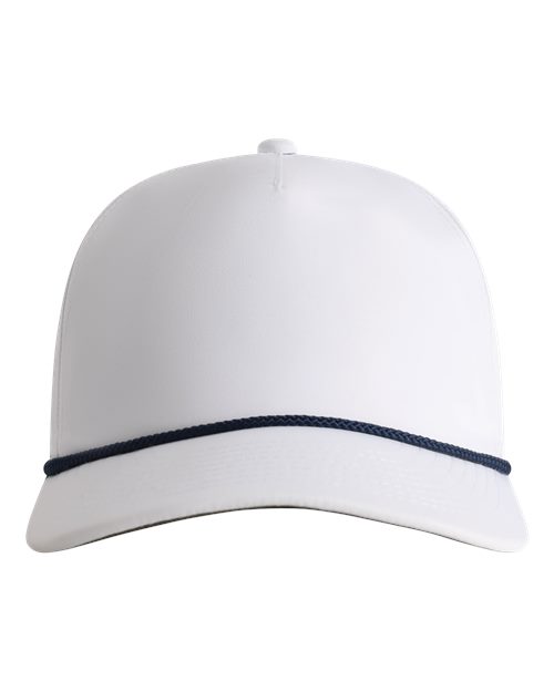 100% recycled polyester performance fabric Moisture management properties Unstructured five panel mid profile retro fit with rope Pre curved visor Moisture management and antimicrobial sweatband Imperial woven label by snapback closure